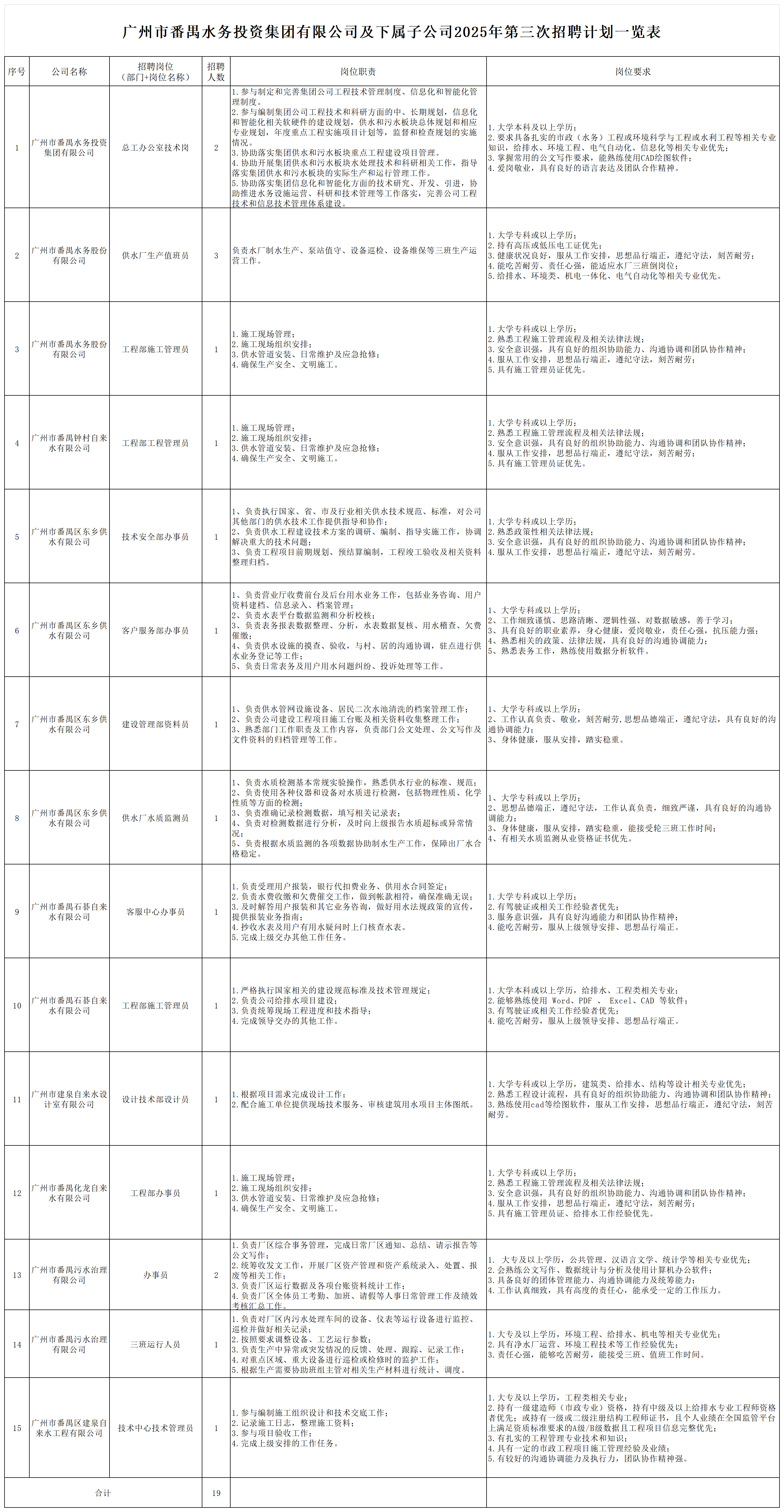 本次计划公开招聘工作人员19名。具体招聘单位、岗位名称及职责、拟招人数、资格条件等信息详见附件《广州市番禺水务投资集团有限公司及下属子公司2025年第三次招聘计划一览表》。